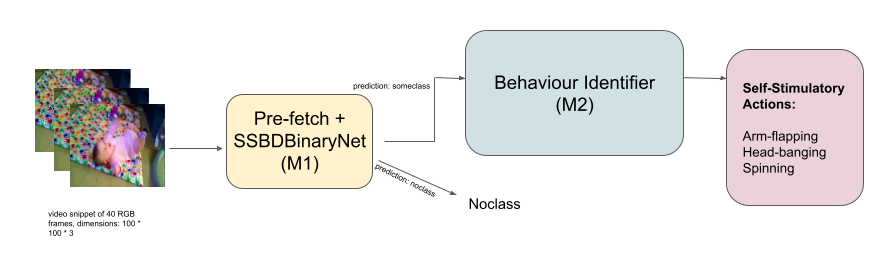 Conventionally, evaluation for the diagnosis of Autism spectrum disorder is done by a trained specialist through questionnaire-based formal assessments and by observation of behavioral cues under various settings to capture the early warning signs of autism. These evaluation techniques are highly subjective and their accuracy relies on the experience of the specialist. In this regard, machine learning-based methods for automated capturing of early signs of autism from the recorded videos of the children is a promising alternative. In this paper, the authors propose a novel pipelined deep learning architecture to detect certain self-stimulatory behaviors that help in the diagnosis of autism spectrum disorder (ASD). The authors also supplement their tool with an augmented version of the Self Stimulatory Behavior Dataset (SSBD) and also propose a new label in SSBD Action detection: no-class. The deep learning model with the new dataset is made freely available for easy adoption to the researchers and developers community. An overall accuracy of around 81% was achieved from the proposed pipeline model that is targeted for real-time and hands-free automated diagnosis. All of the source code, data, licenses of use, and other relevant material is made freely available.